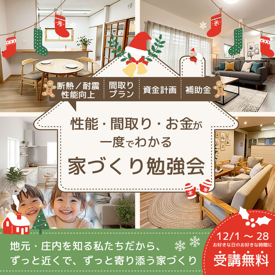 庄内の気候を知り尽くした私たちが、家づくりに欠かせない「性能」「間取り」「お金」の3つを、お客様のペースに合わせてやさしく解説する個別相談型の勉強会です。
