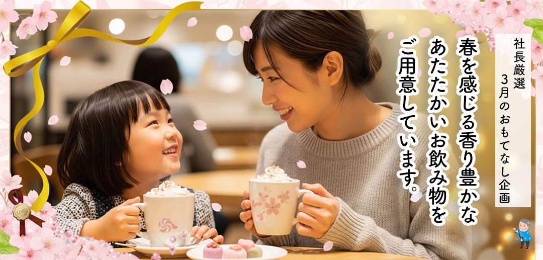 3月は、春らしいやさしい甘さのドリンクや香り豊かな温かいお飲み物をご提供。家づくりのお話の合間に、ほっと一息つける時間をお届けします。