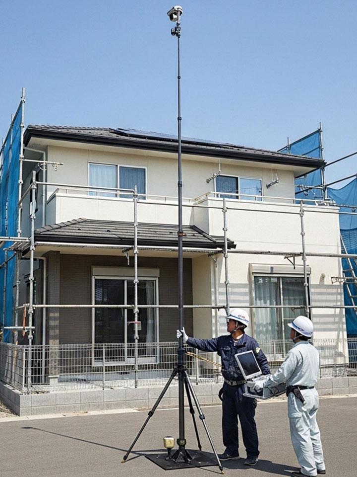 高所の撮影できるも屋根点検カメラシステム。最近はドローンも人気ですが、住宅街でもこのカメラなら安心です。