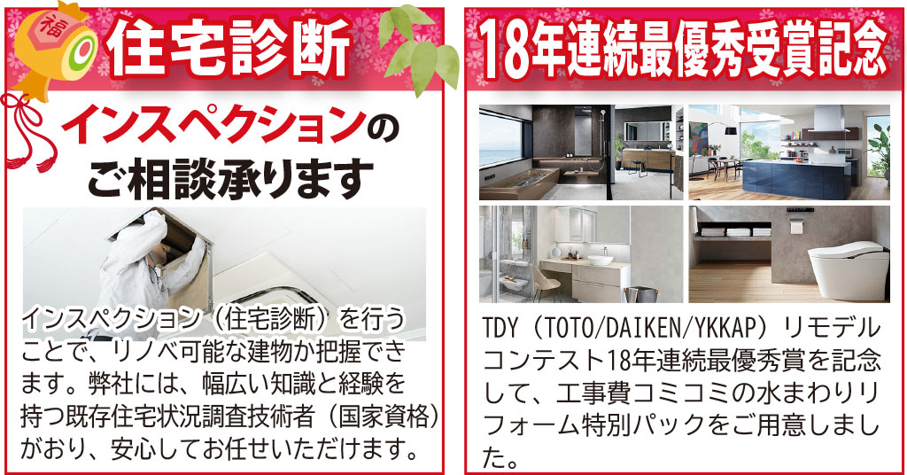 初売りならではの「お餅入りぜんざい」、「お抹茶」や「京菓子」の振る舞いはじめ、ご来場記念プレゼントとして、アクアプラス名物・ハズレなし「おいしいお肉と豪華賞品が当たる抽選会」をご用意しました。さらに、ご予約特典として「クオカード1000円分」、お見積の方に「おこめ券」をプレゼント。