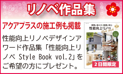 弊社施工事例掲載、性能向上デザインアワード作品集「性能向上Style Book Vol.2」(定価1,320円)も、ご来場特典としてご希望のお客様に進呈します。