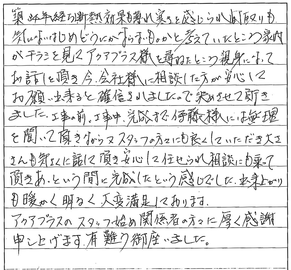 工事の前、工事中、完成まで伊藤様には、無理を聞いて頂きながら又スタッフの方々にも良くしていただき大工さんも気さくに話して頂き安心して任せられ相談にも乗って頂き、あっという間に完成したという感じでした。出来上がりも暖かく明るく大変満足しております。
